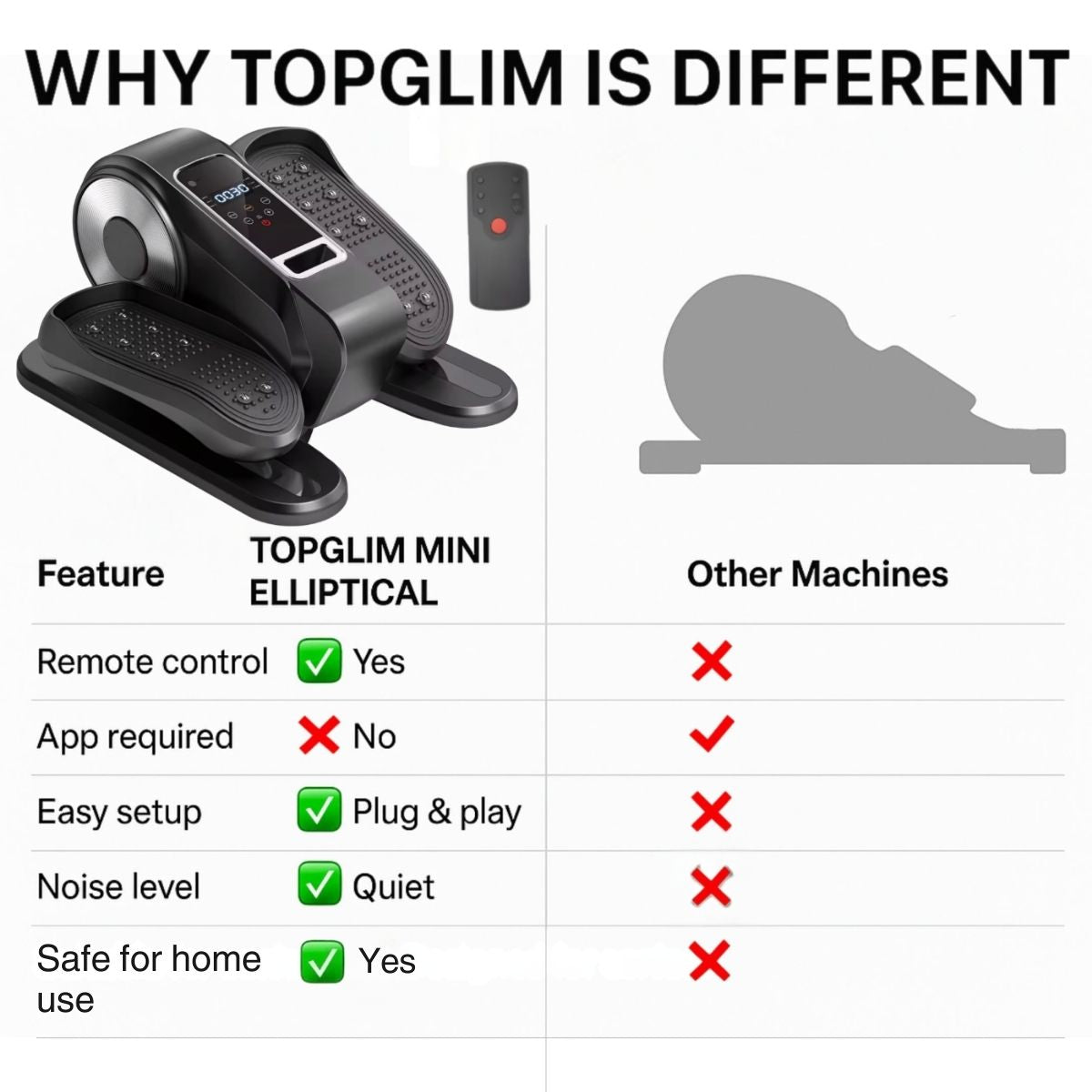 The TopGlim Mini Elliptical Trainer is designed for seniors who want to stay active safely and comfortably — without putting pressure on the knees, hips, or joints.